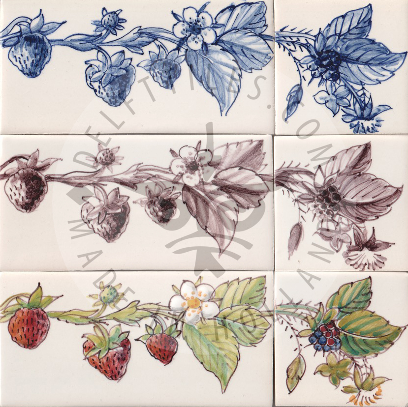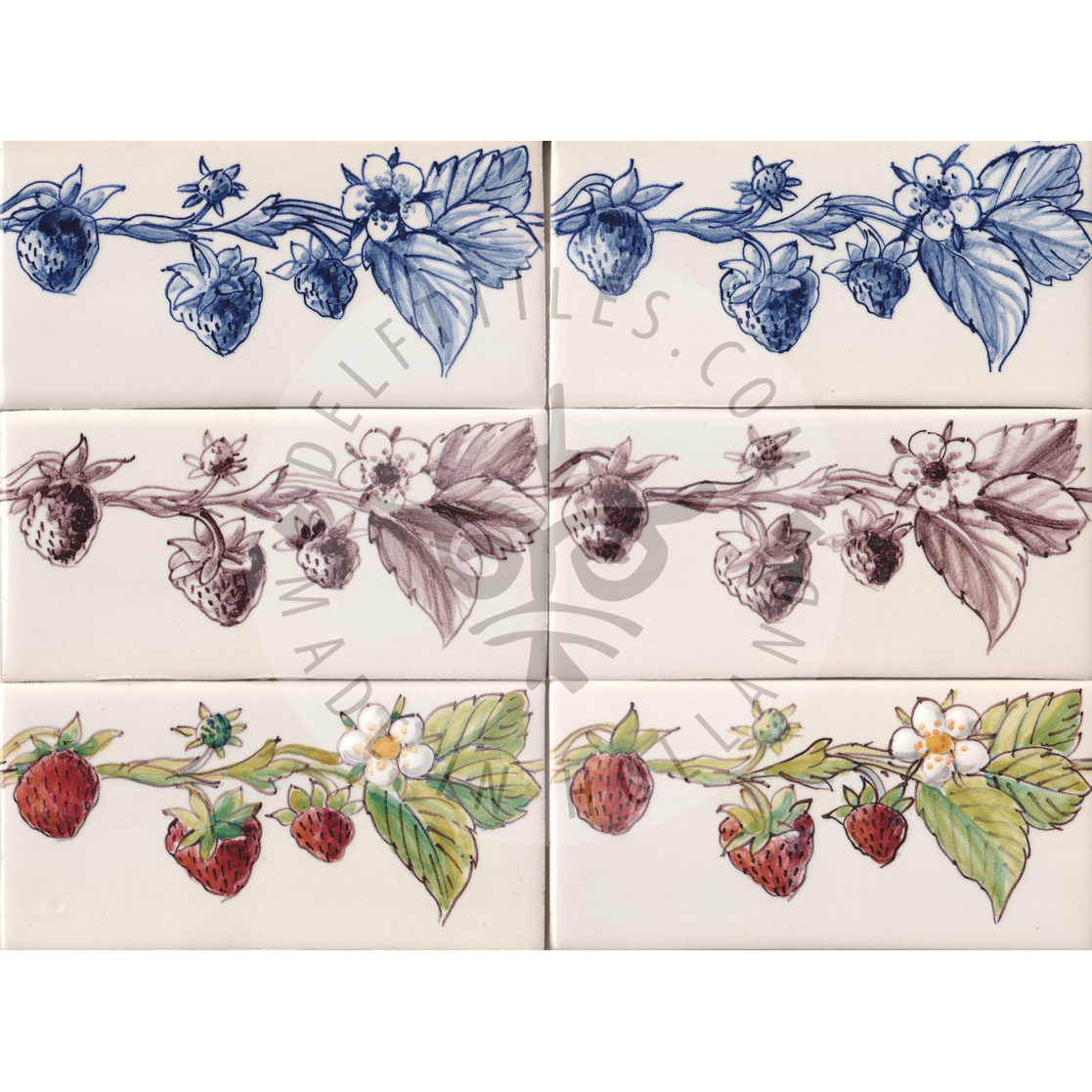 Border Tile 38 – StrawBerry 13 x 6.5 cm (5-1/8 x 2–7/16 in) Corner pieces: 6.5 x 6.5 cm (2–7/16 in) Can be painted on a full field tile as well (5-1/8 in sq.) Bullnose edge available on request. Product Number: B38 Tile color Off white Ivory Antique look i - tiles have more irregularities - invisible or visible made crackled glaze Decoration color Blue Sepia Multi color Border Tile 38 - StrawBerry quantity Add to cart Add to Quote Product already in the list. View quotation list SKU: B38 Categories: Border, Border tiles, Delft Blue tiles & panels